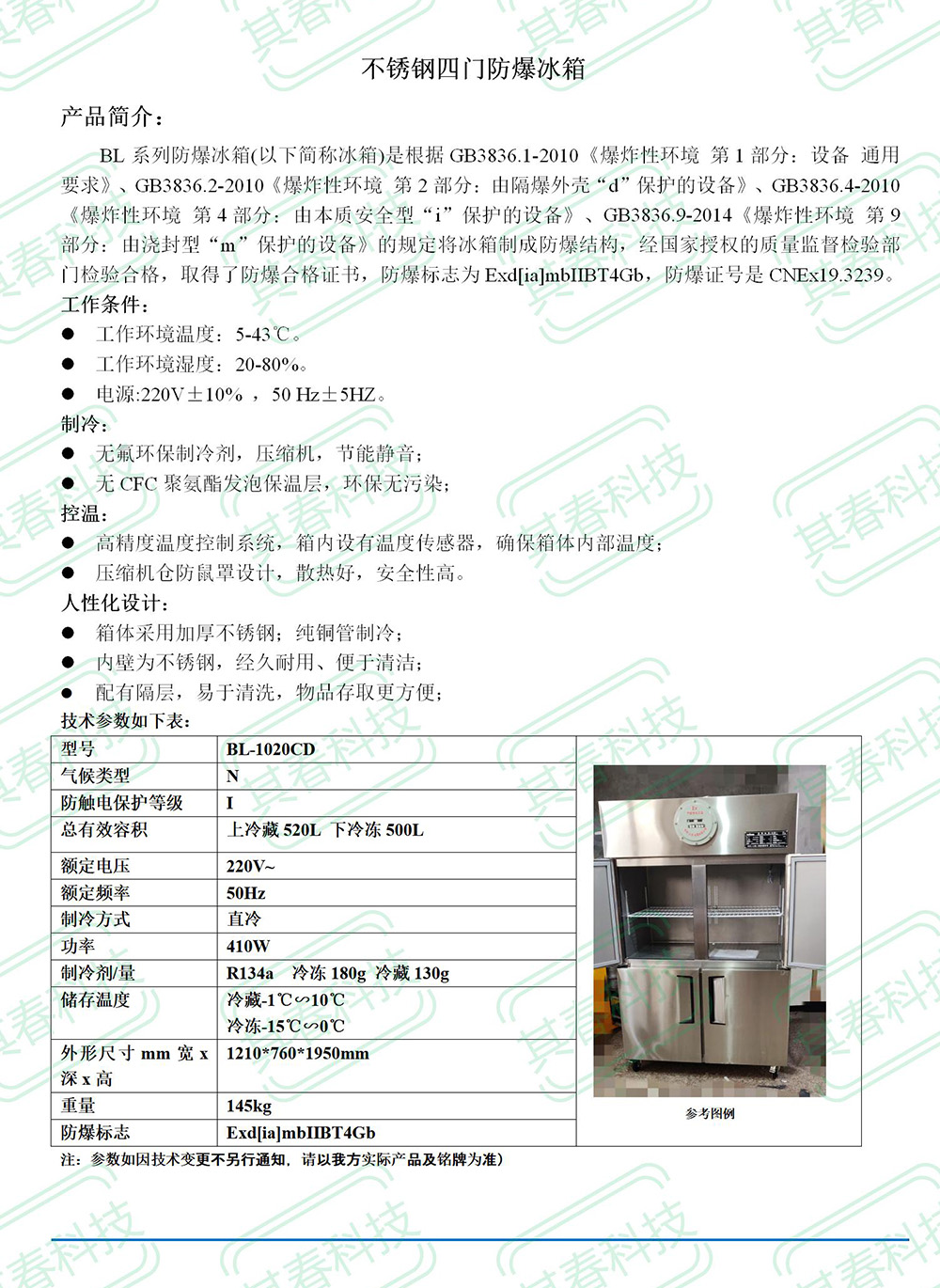 冷藏冷凍防爆四門冰箱不銹鋼定做BL-1020CD